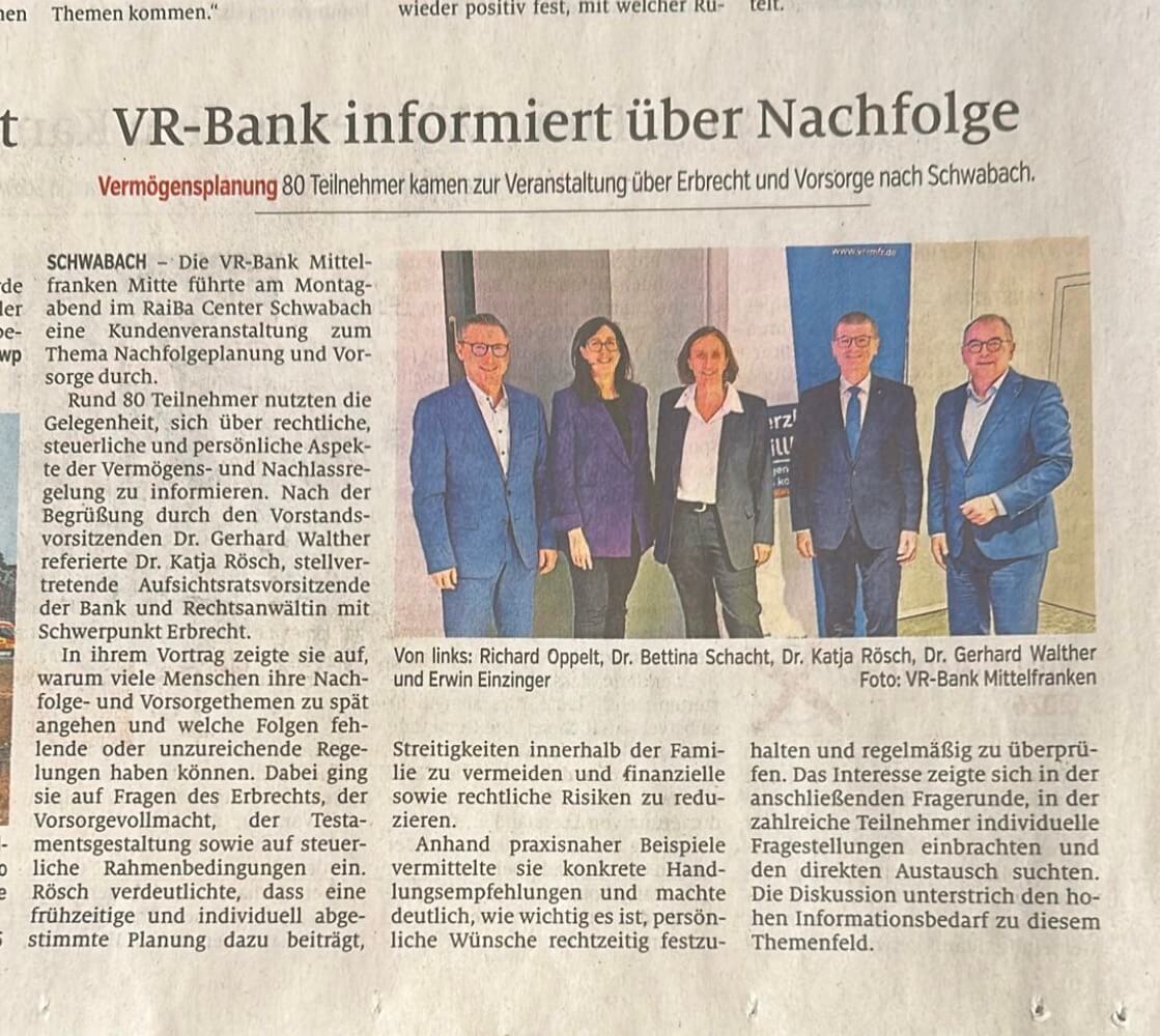 Frau Dr. Rösch referiert bei der VR-Bank Mittelfranken Mitte eG am Montag 19. Januar 2026 im RaiBa-Center in Schwabach.